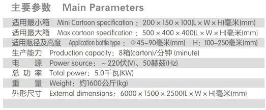 配套瓶裝生產線的后道全自動裝箱生產。同時擁有多項國家技術,整機性能可靠,產能高,包裝效果美觀。